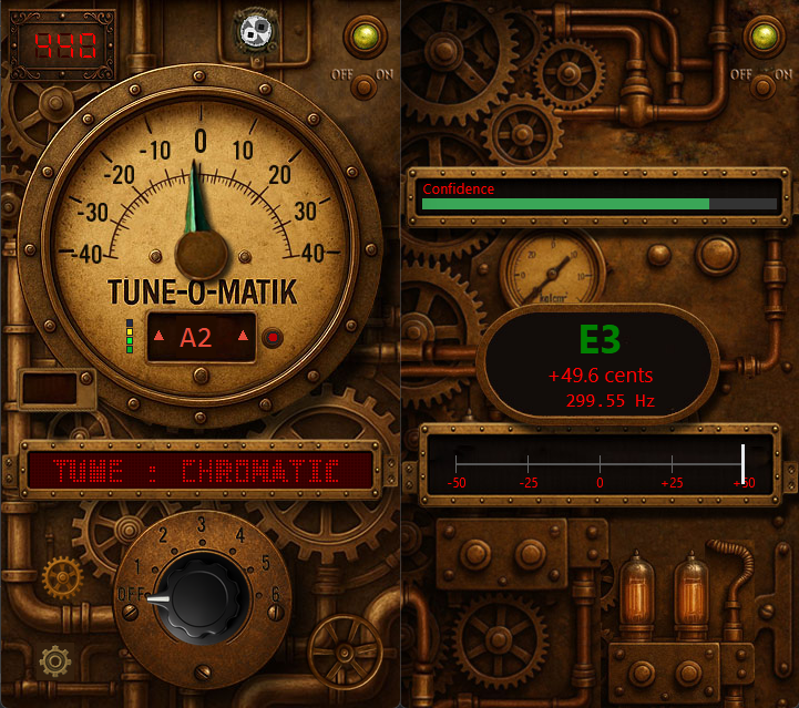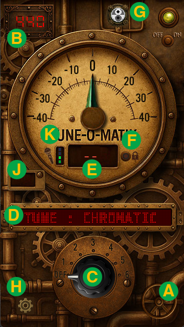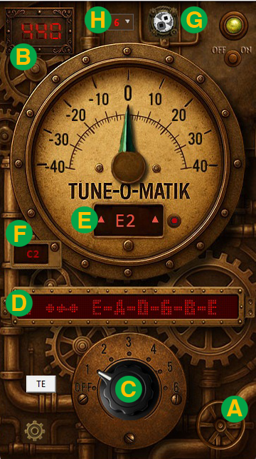 C) Der STELLKNOPF (Mouse Wheel benutzen) ist das zentrale Element in dieser App. In Stellung "OFF" befindest du dich im Chromatik-Modus. Die TUNE-O-MATIC erkennt, welche Note du anspielst (+/- 50%) und hilft dir, sie genau zu tunen.